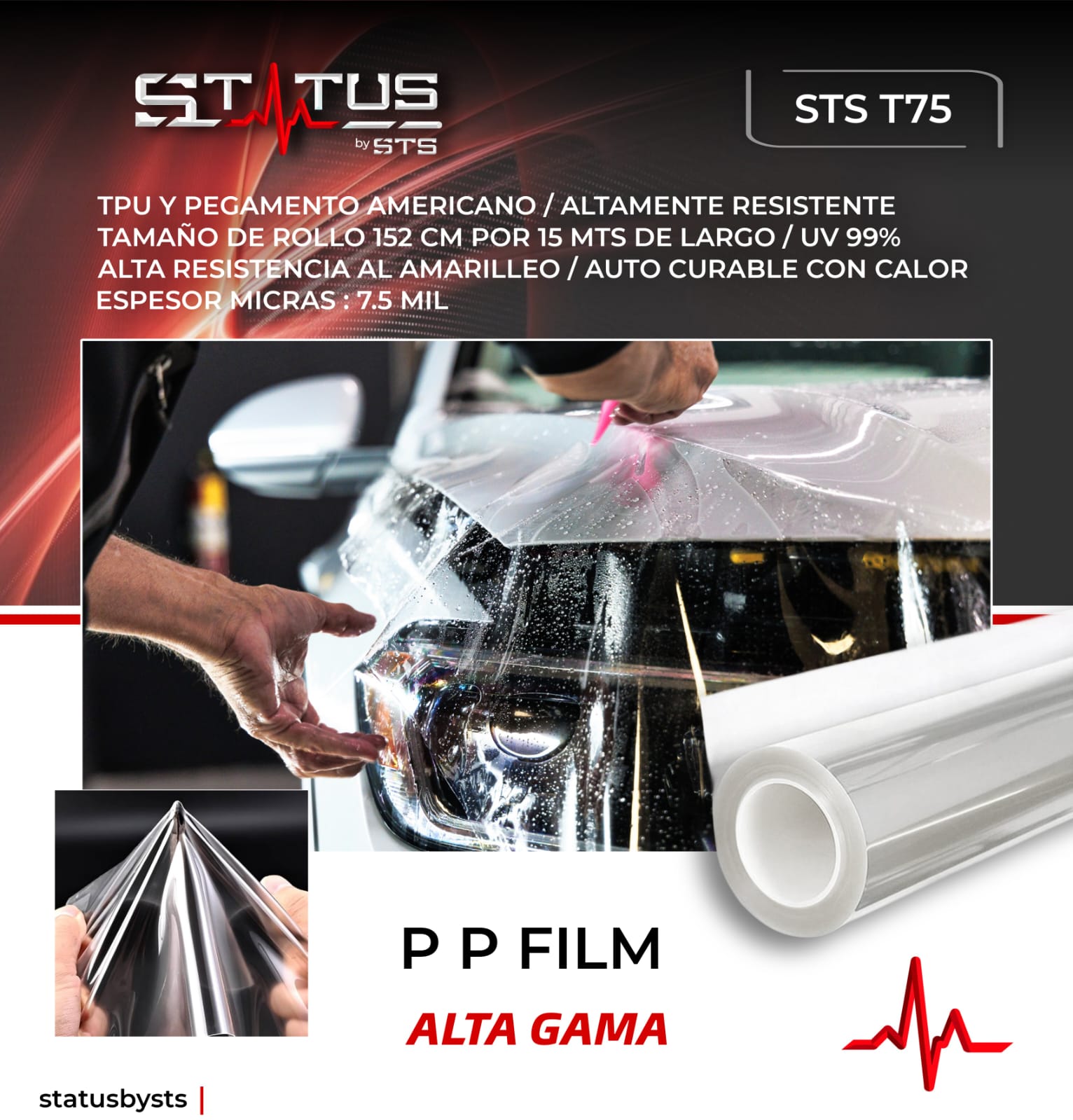 Fabricado con TPU de origen americano de última generación y adhesivo premium estadounidense, el PPF Status Alta Gama garantiza una adherencia uniforme, flexibilidad superior y acabado cristalino, sin alterar el color original de la pintura.